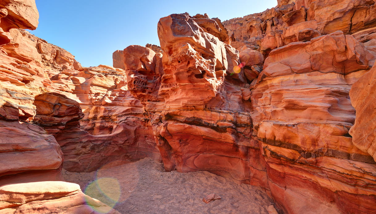 Tra le bellezze meno note d’Egitto c’è senza dubbio il Canyon Colorato, una stretta gola scavata tra le ripide pareti rocciose nella regione settentrionale del Monte Sinai. Si tratta di una formazione naturale, proprio come il più celebre Grand Canyon americano: in questo caso, però, il fiume che lo ha creato oggi non esiste più. Restano millenni di storia e di geologia che, dal fondo del canyon, ci regalano uno spettacolo emozionante: questa strettissima lingua di terra si intrufola tra le rocce della montagna, profonda mediamente una decina di metri (ma ci sono punti in cui le pareti raggiungono i 40 metri).