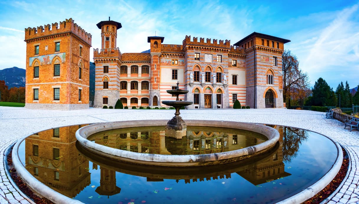 Il risultato fu spettacolare, uno dei castelli più fiabeschi di tutta la regione, ricco di decorazioni che affiancano illustri personaggi che hanno fatto la Storia come Alessandro Volta e George Stephenson, inventore della locomotiva, a raffigurazioni religiose come la Madonna con Bambino.