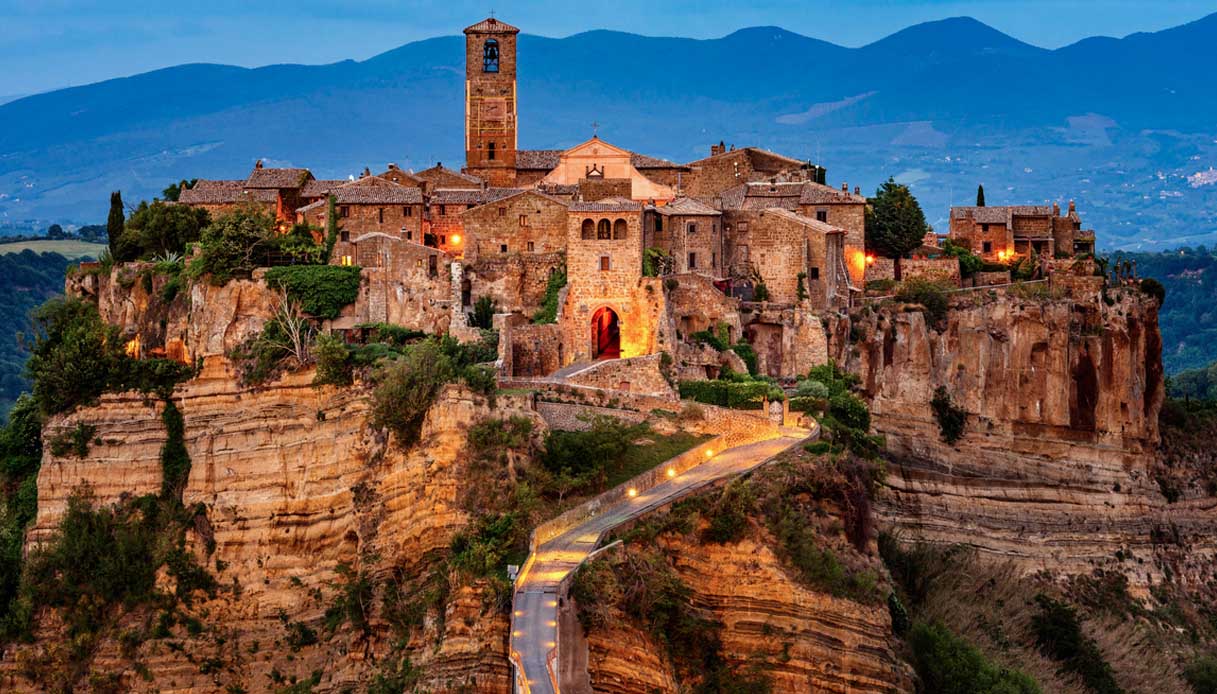 Un piccolo e antico villaggio arroccato su una collina, nel cuore della Valle dei Calanchi, ed un unico ponte che lo collega con il resto della civiltà. Ci troviamo nel meraviglioso borgo di Civita di Bagnoregio, in provincia di Viterbo, nel cuore della Tuscia laziale. Un luogo sospeso nel tempo e nello spazio, che la fiction “Il nome della rosa” ha voluto celebrare scegliendolo come protagonista tra le suggestive location in cui è stata girata.