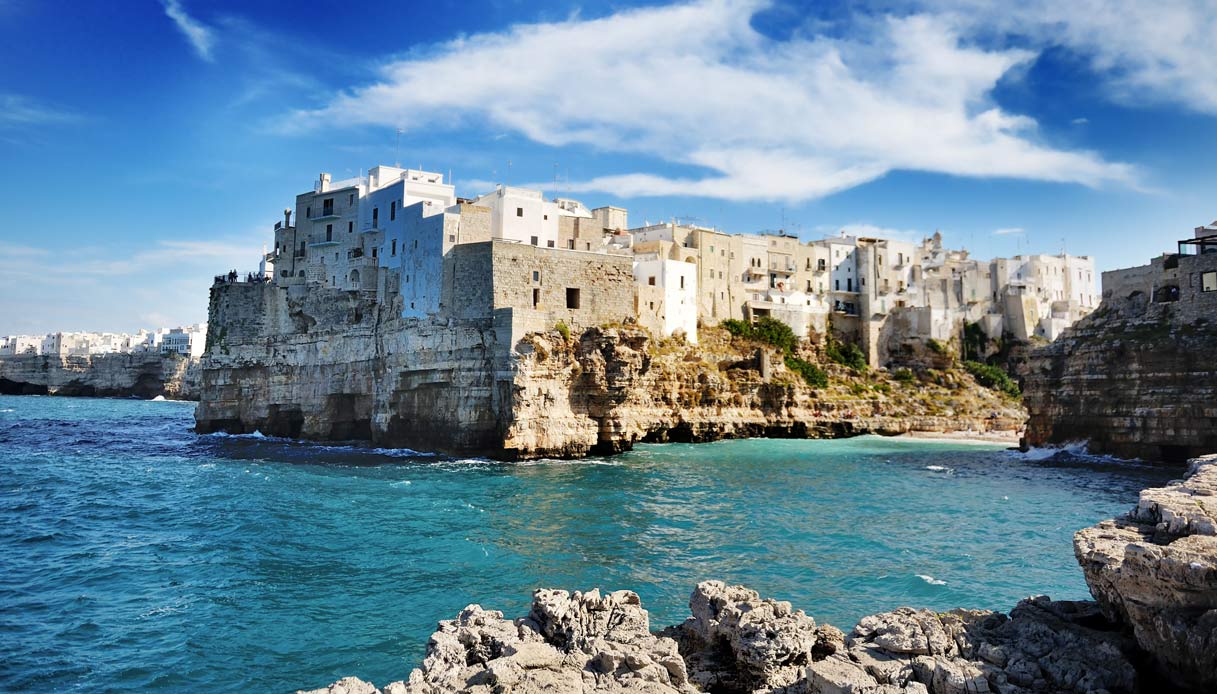 Come non rimanere abbagliati dal colore del mare che, in questo film, fa davvero sognare. La costa di Polignano è formata da alcuni tratti di roccia e ciottoli e altri di sabbia fine e dorata.