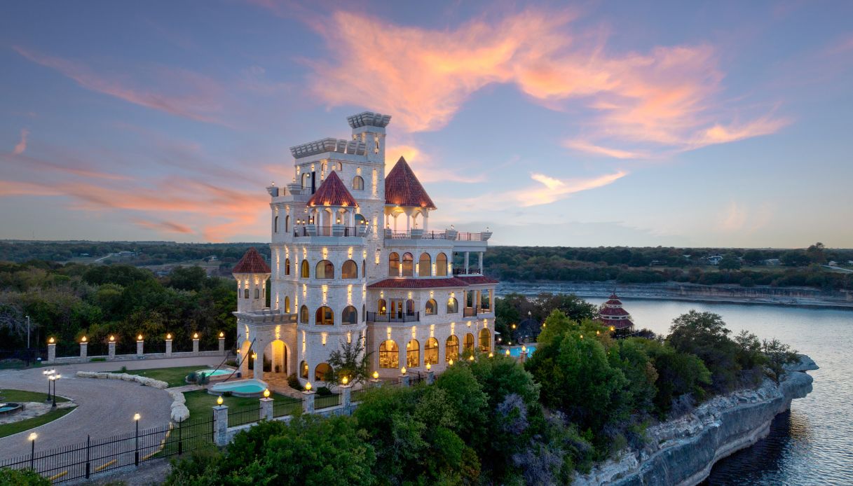 Come anticipato, il castello è situato a Clifton, in Texas, e più precisamente nei pressi del lago Whitney. Arroccato su una scogliera, il castello si snoda su 5 piani, e offre una vista mozzafiato su tutto il panorama circostante. L’accesso avviene attraverso un ponte levatoio che permette di raggiungere il grande foyer. Il primo ambiente che si incontra è quello della sala da ballo che si estende per circa 3.000 metri quadrati. All’interno dell’edificio, poi, ci sono 10 opulente camere da letto per gli ospiti, 15 bagni e una suite nuziale.