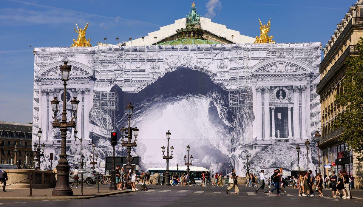 A firmare questa nuova opera urbana, effimera e bellissima, è stato JR, uno degli artisti più celebri e apprezzati del nostro secolo. È stato proprio lui a rivestire la facciata dell’Opéra Garnier, attualmente in restauro, con un’installazione davvero sorprendente che ha trasformato l’edificio nella porta di accesso alla caverna platonica.