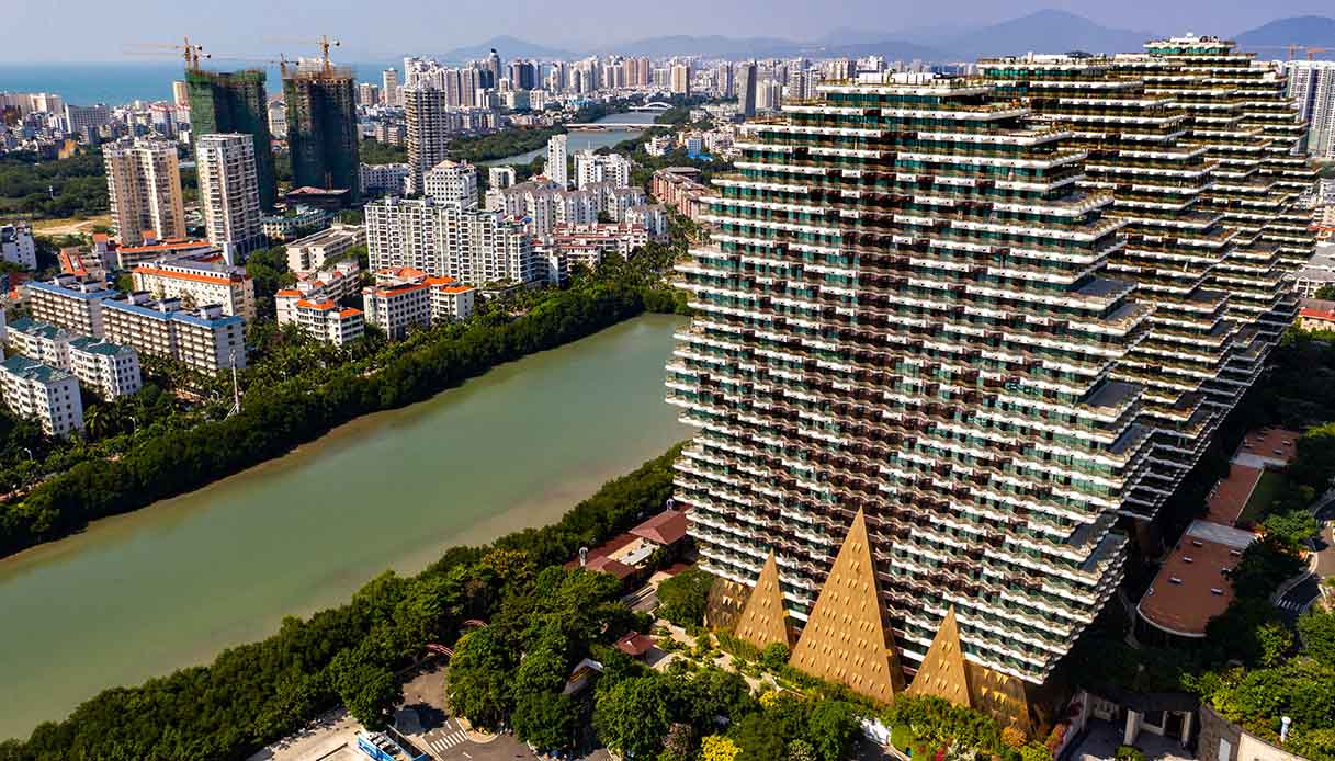 Niente di tutto questo, gli edifici in questione appartengono a un unico e grande hotel che domina l’isola di Hainan, nel sud della Cina.