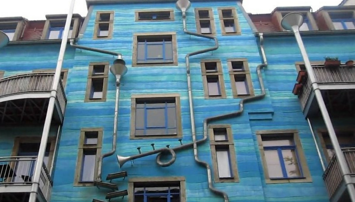 Ma non è finita qui: perché il palazzo è stato anche ristrutturato per risultare molto particolare. Fa infatti parte di un altro progetto che ha come obiettivo quello di rendere più colorata e vivace Dresda, rimodernando gli edifici con tonalità accese e particolari. I colori scelti per pitturare la facciata sono brillanti e richiamano l’elemento acqua. Non a caso l’intero edificio è azzurro e turchese, con tubi e coni in rame installati su tutta la sua lunghezza.