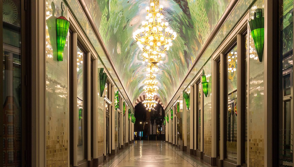 Una volta entrati nel Beurspassage, l’attenzione è completamente catturata e rapita da quel magnifico e straordinario soffitto che si estende per 450 metri quadrati di meraviglia.