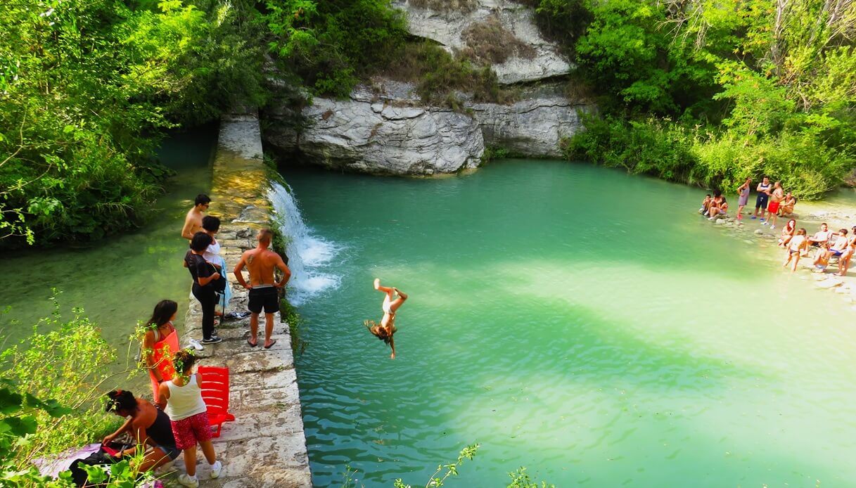 Il Castellano è una vera e propria benedizione nei mesi caldi dell’anno. Le sue acque chiare e fresche attraversano tumultuose il territorio montagnoso al confine tra Marche e Abruzzo, per poi offrire il meglio agli appassionati di wild swimming in una serie di piscine naturali d’acqua dolce una più spettacolare dell’altra tra Castel Trosino e Ascoli Piceno.