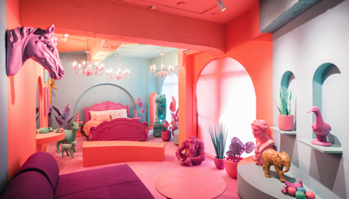 La stanza onirica si trova tra Shinjuku e Shibuya, nel quartiere Harajuku, uno dei più famosi di tutta la città. Qui, giovani giapponesi e viaggiatori provenienti da tutto il mondo si incontrano nei vivaci bar e nelle caffetterie trendy per vivere in prima persona il variegato universo della cultura pop giapponese. È un po’ come se questa, esplorata nella vivace zona di Harajuku, rivivesse nella stanza.